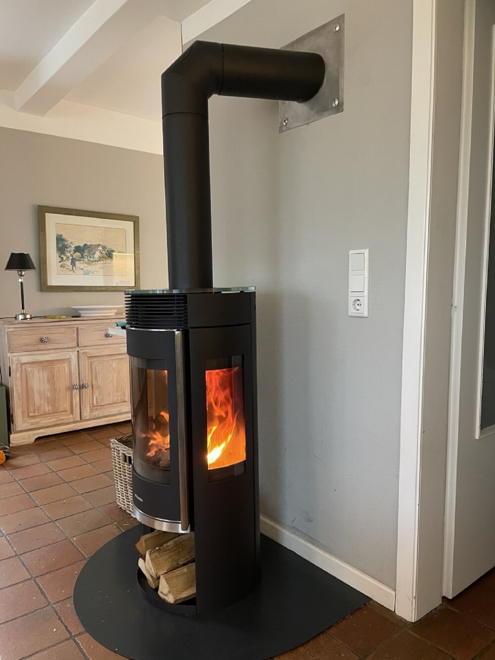 Kaminofen im Wohn- und Esszimmer mit Blick zur offenen Küche