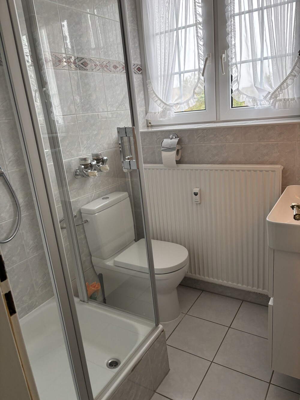 Das helle und große Schlafzimmer hat ein Doppelbett und einen Schreibtisch für Ihre Urlaubspost. Auch hier können Sie morgens gleich einen Blick auf die See genießen. Ein kleines, helles Badezimmer mit Fenster und Dusche erwartet Sie.