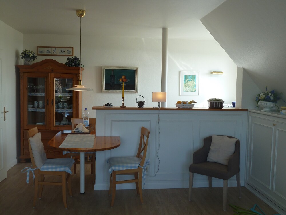 In dem geräumigen und hellen Wohnzimmer finden Sie einen Fernseher mit DVD-Player. Die komplett ausgestattete Küche ist offen zum Wohnbereich hin und mit geschmackvollem Design gestaltet worden. Während man das Essen zubereitet, kann man einen tollen Blick auf die Nordsee genießen.