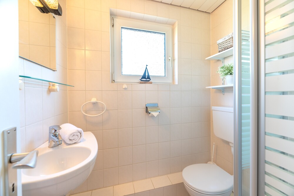 Das moderne Badezimmer ist mit einer Dusche und einem WC ausgestattet, sowie einem Waschbecken und einem Haartrockner.