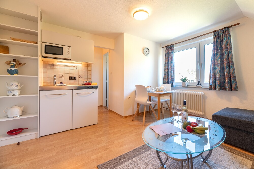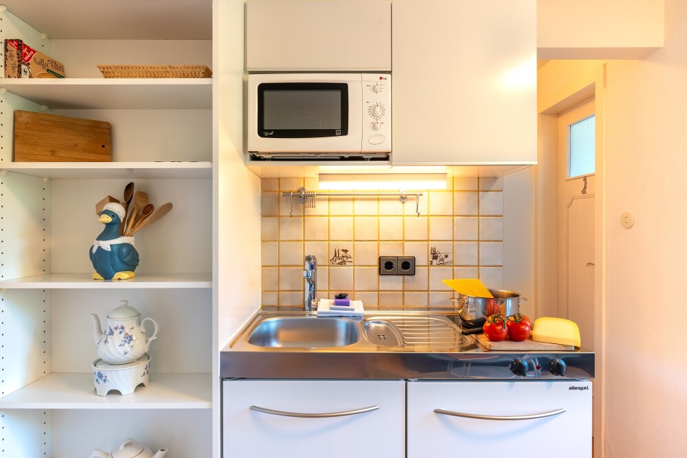 In der Küche finden Sie eine standardmäßige Ausstattung, was Sie für die Zubereitung köstlicher Mahlzeiten benötigen vom Herd über die Mikrowelle bis zur Filterkaffeemaschine.