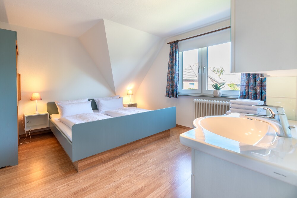 Das Schlafzimmer ist mit einem komfortablen Bett ausgestattet, das einen erholsamen Schlaf garantiert.