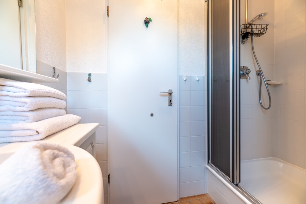 Im Badezimmer sind eine Dusche sowie ein WC mit Waschbecken vorhanden.