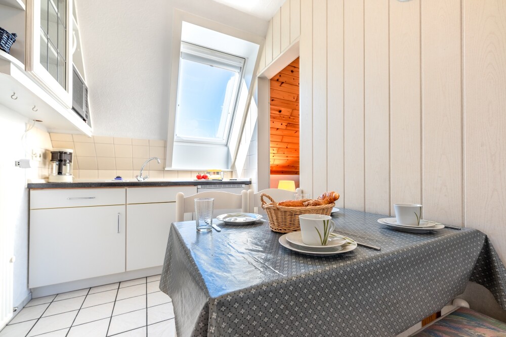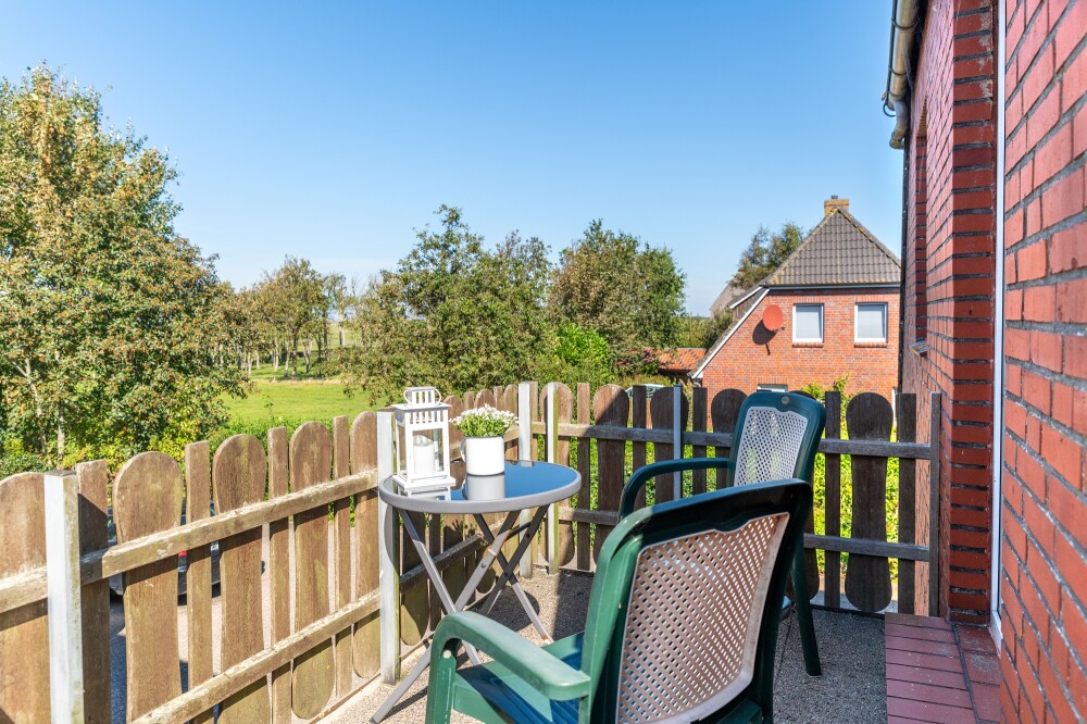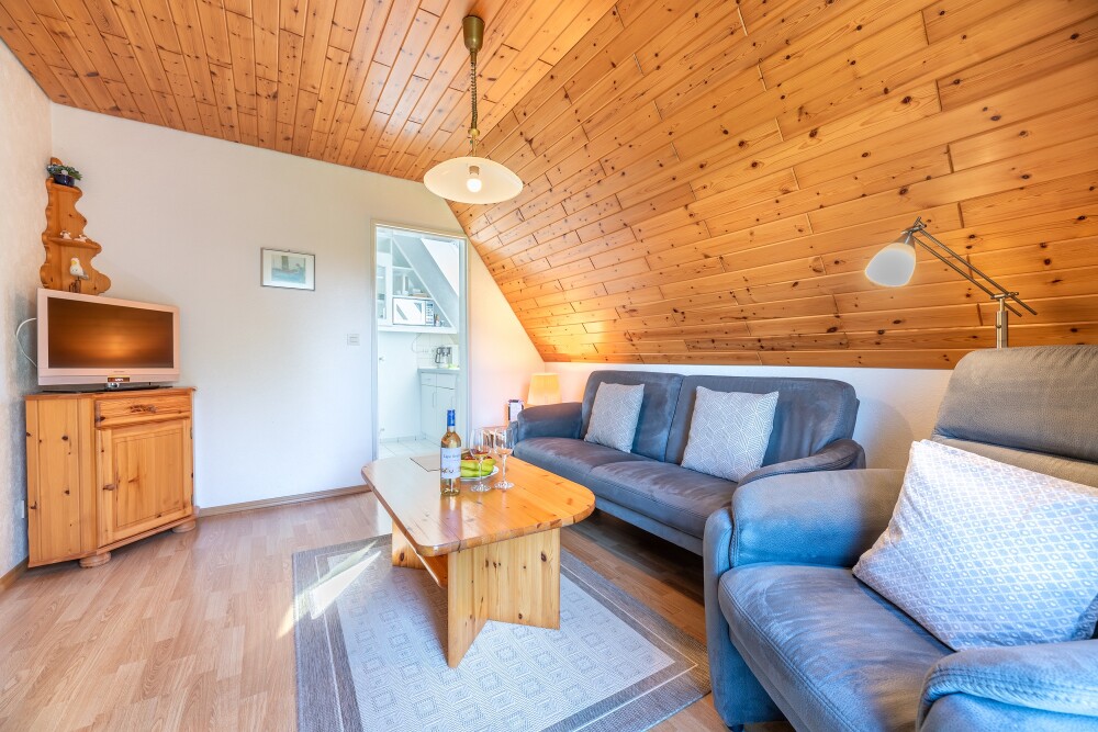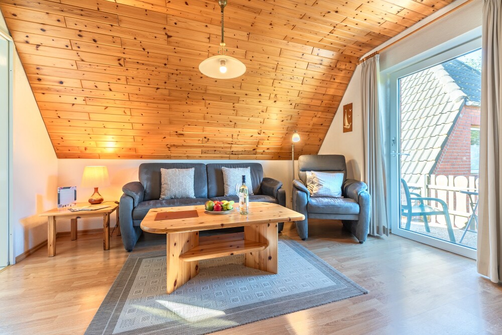 Ein helles und einladendes Wohnzimmer mit einer Sofaecke und einem Essbereich, in dem Sie gesellige Abende verbringen können. Der Balkonzugang mit Blick Richtung Deich ist wunderschön.